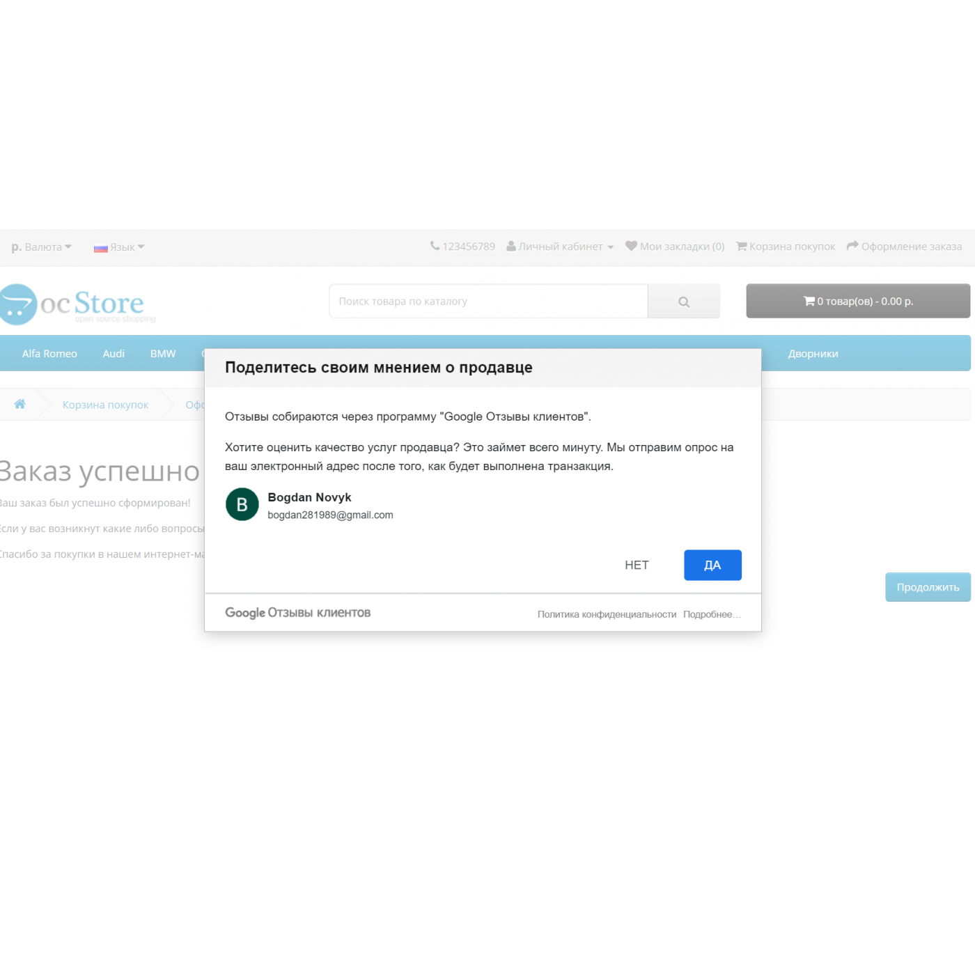 Цей модуль дозволяє швидко і просто підключити ваш магазин до Google Reviews для отримання відгуків про покупку у вашому магазині. Модуль автоматично виведе діалогове вікно на сторінці подяки про замовлення, з пропозицією покупцю про залишення відгуку через вказану в налаштуваннях кількість днів.