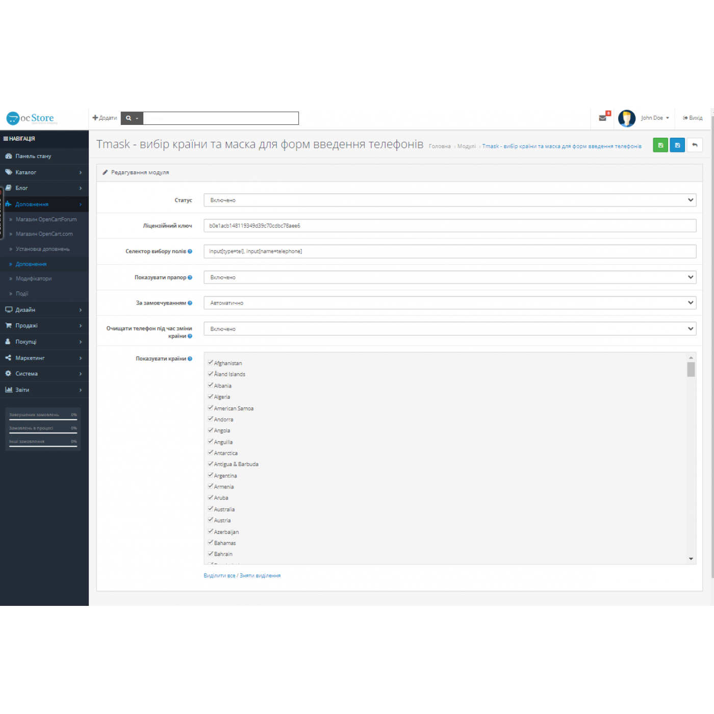Модуль створений для стандартизації введення номерів телефонів у формах на Opencart, він запогігає невірному введенню номера телефона клієнтом. Використовується як маска номеру телеофну, так і вибір країни власника телефону, що значно спрощує сам процес вводу телефону. Модуль працює з всіма країнами, які є у опенкарт.